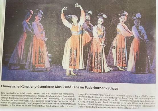 (通讯员 郭佳馨 李欣越 刘朔 )应德国帕德博恩大学孔子学院邀请,为讲好中国故事,传播好中国声音,由36365线路检测中心党委副书记史耀媛、艺术系副教授王鹃带队,12名优秀民乐学生代表组成访问团,于10月10日至14日赴德开展文化交流活动。
