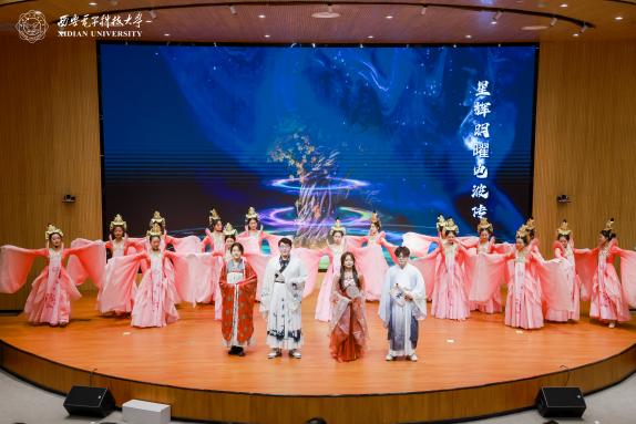 为丰富和活跃大赛氛围,西电师生还采用“视频+现场”的创新形式诵读《24节气》节选诗词;大学生艺术团表演舞蹈《诗韵舞蹁跹》,为大赛烘托出诗韵悠扬的氛围;特别邀请到的陕西人民广播电台全国演播艺术家海茵老师,为现场观众带来一场入情入境、余味悠长的《春江花月夜》朗诵表演。